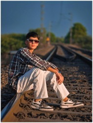A relaxed young man wearing sunglasses and fashionable clothes sits confidently on railroad tracks outdoors.