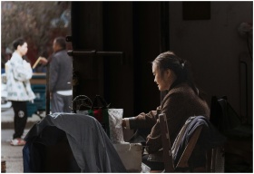 A focused woman operates a sewing machine in a shadowy indoor setting with people visible outside.