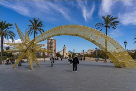 Golden star sculpture and arch in a vibrant plaza in Valencia, Spain under a clear blue sky.