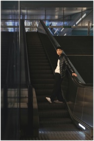 Young man in winter jacket standing on an escalator in a contemporary subway station.