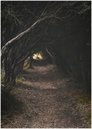 Eerie forest pathway surrounded by dense, shadowy woods creating a tunnel-like ambience.