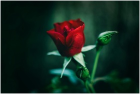 Beautiful close-up of a red rose in bloom accompanied by green buds against a dark background.