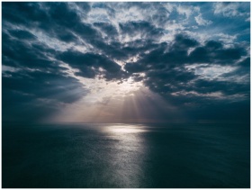A breathtaking view of the ocean at sunset, with dramatic clouds and sunrays breaking through, creating a serene seascape.