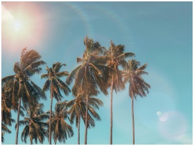 Idyllic palm trees with sun flare against a clear