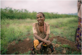A cheerful Ethiopian woman sits in a green field,
