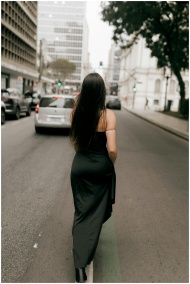 A woman walks down a city street, surrounded by urban buildings and traffic.