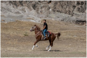 Man riding a horse through rocky terrain in Afyonk