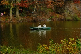 Two people rowing on a serene lake in Central Park during fall, surrounded by colorful foliage.
