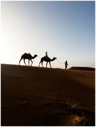 Silhouette of camels and person walking across a sandy desert dune at sunrise.