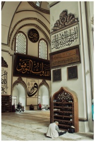 A serene view of Ulu Camii Mosque's interior in Bursa, showcasing intricate Islamic calligraphy and architecture.