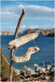 A rustic wooden sign marks Psaromoura Beach, a pic