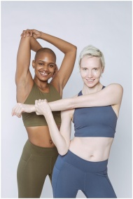 Diverse female models in sportswear smiling and looking at camera while stretching arms against white background