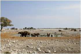 African elephants and wildlife gather at a Namibian waterhole on a sunny day.