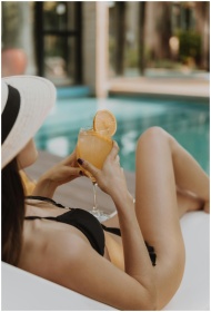 Woman in bikini relaxing by the pool, holding an o