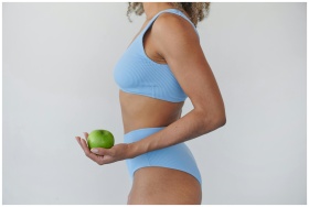 A woman in blue activewear holding a fresh green apple, symbolizing a healthy lifestyle.