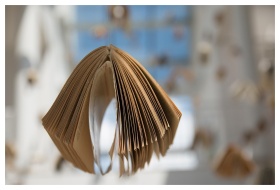 An abstract display of folded vintage books showca
