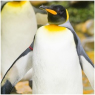 A vibrant King Penguin with vivid plumage standing outdoors in a zoo setting.