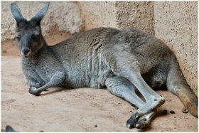 A kangaroo comfortably lying down on a sandy surface in an indoor zoo environment.