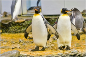 Two king penguins standing on rocky terrain in a zoo exhibit.