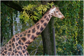 Close-up of a giraffe in a Swiss zoo amidst lush greenery.