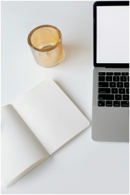 Clean and minimalist workspace featuring an open notebook, laptop, and a glass cup on a white surface.