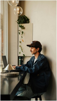 Young man wearing cap and jacket works on laptop i