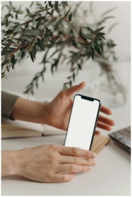 A minimalist smartphone with a blank screen in a natural indoor setting, surrounded by greenery.