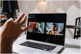Hands gesturing during a video call on a laptop screen, showing two people in a virtual meeting.