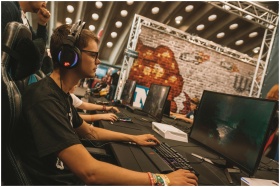 A young male gamer intensely focused during an esports event at an indoor gaming convention.