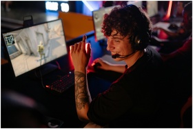 A young gamer in a black shirt enjoys an intense online game on a computer, smiling confidently.