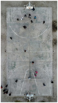 Top-down drone view of a basketball game on an outdoor court in Argentina.