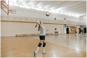 Action shot of a female athlete serving in an indoor volleyball game.