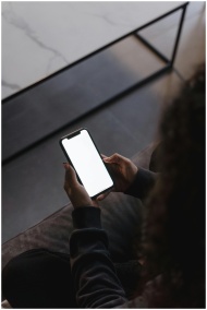 Person holding a blank screen smartphone in a dimly lit indoor setting, perfect for mockup use.