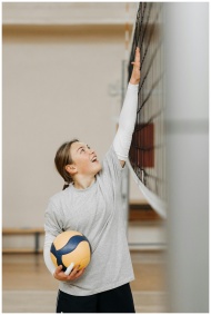 A young female athlete smiling while reaching for a volleyball net indoors.