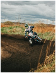 Exciting motocross rider cornering on dirt track o