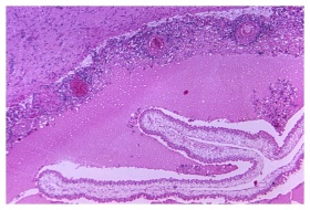 Photomicrograph of a brain tissue specimen. Original image sourced from US Government department: Public Health Image Library, Centers for Disease Control and Prevention. Under US law this image is copyright free, please credit the government department whenever you can”.