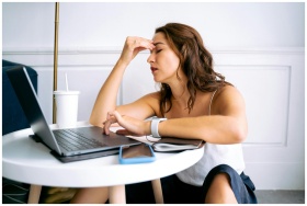 Woman experiencing work fatigue with laptop at a table, indicating stress and tiredness.