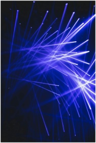 Dynamic blue laser lights create a vibrant and modern visual effect in a dark indoor setting.