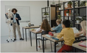 Teacher explaining biology with skeleton model to attentive students in classroom.