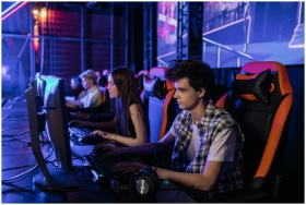 Gamers focused on a competitive esports event, sho