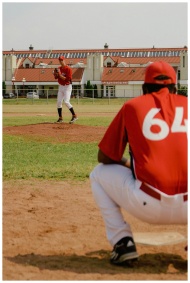 Two baseball players in action on a sunny day, with pitcher ready to throw and catcher positioned.