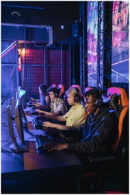 Group of focused gamers playing during a professional esports event.