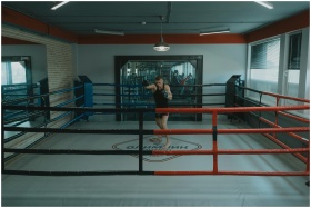 A professional boxer training alone in a well-lit
