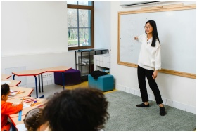 Female teacher instructing a group of diverse students in a modern classroom with natural light.