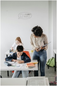 A teacher in a classroom with students, focusing o