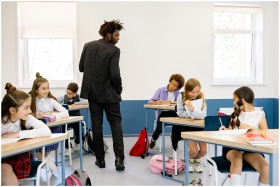 A teacher watches over students who are engaged in