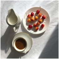 Top view of ripe sweet cherries on plate placed on white cloth near mug of hot coffee and saucer with milk