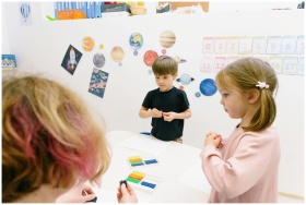 Children playing with modeling clay in a classroom, fostering creativity and education.