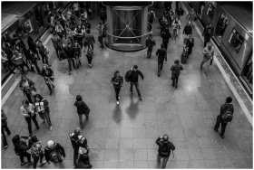 Black and white image of commuters in a bustling subway station, captured from above.