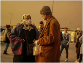 Two adults in an urban setting at twilight, speaking with face masks on, capturing everyday life.